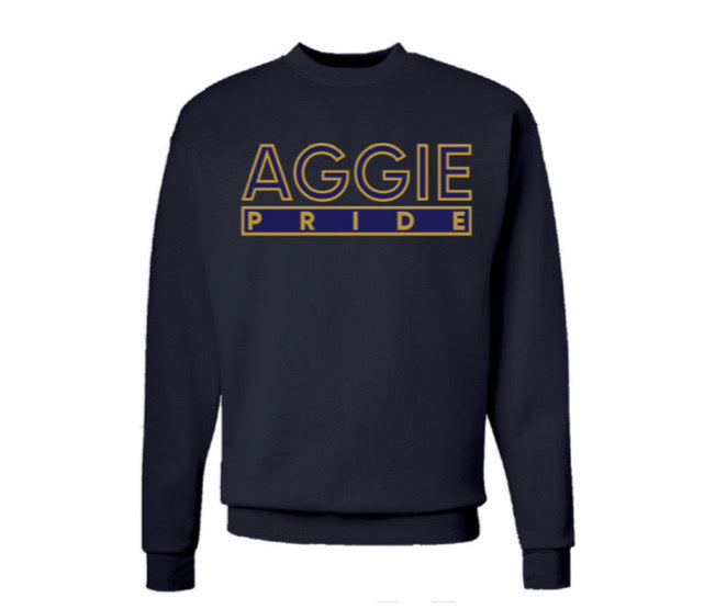 The “Aggie Pride” Crewneck Sweater in Navy Blue and Gold (Embroidered)